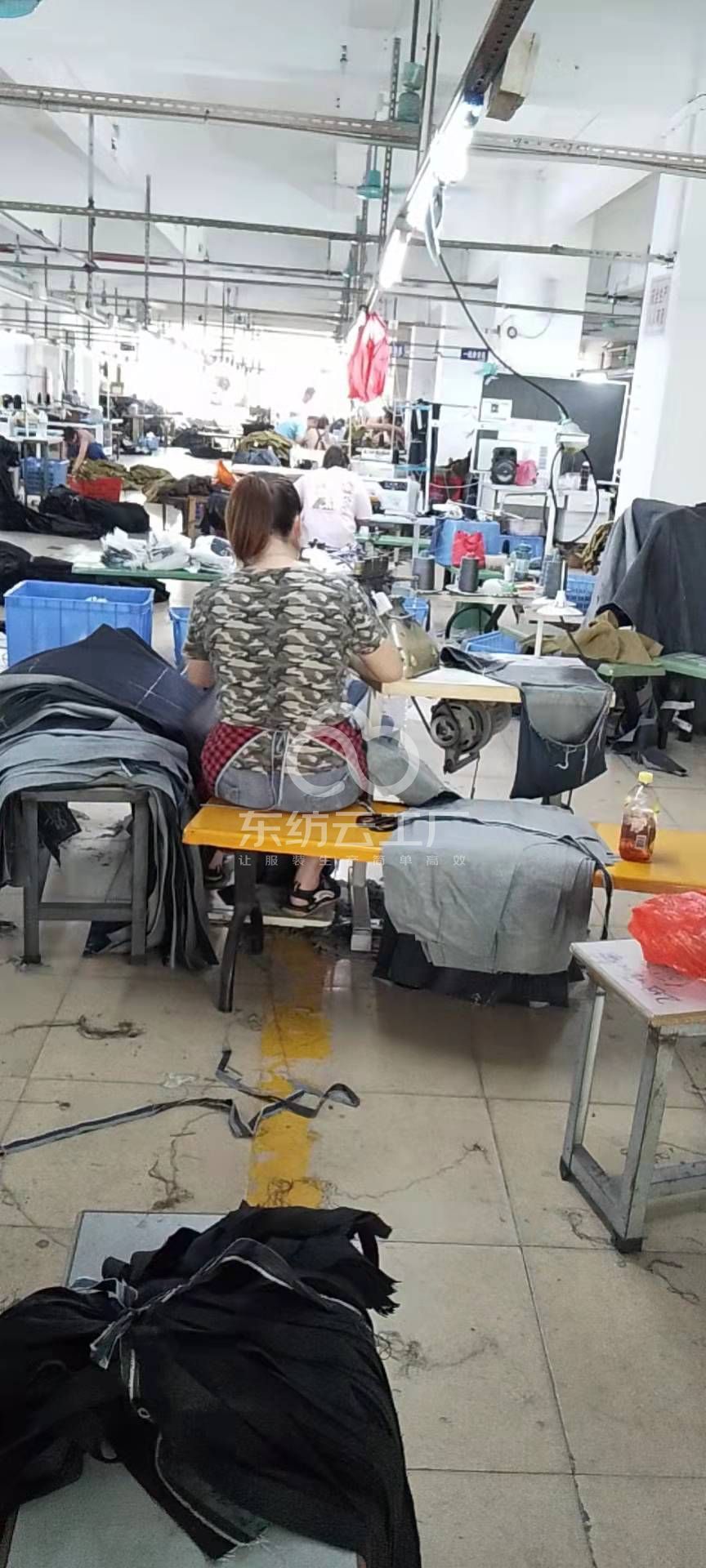 裤头车:3台,定扣机:2台,剪线机:6台,断布机:1台,颗粒炉:1台,平车:28台,电烫炉:2台,电脑凤眼:1台,打边机:2台,双针车:8台,电剪:2台,烫台:4台,冚车:1台,唛架机:1台,裁床:2台,五线:5台,四线:1台