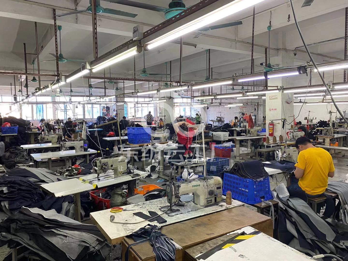 裤头车:1台,挑脚机:1台,剪线机:5台,钉扣:3台,颗粒炉:3台,平车:20台,电烫炉:3台,直眼:1台,电脑凤眼:1台,打边机:5台,双针车:8台,电剪:2台,烫台:5台,唛架机:1台,裁床:1台,五线:3台,四线:2台