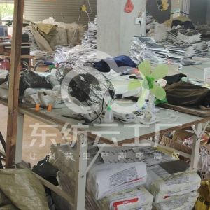 松布机:1台,挑脚机:3台,验布机:6台,钉扣:3台,颗粒炉:1台,平车:70台,电烫炉:1台,直眼:2台,电脑凤眼:1台,双针车:3台,电剪:3台,烫台:4台,裁床:2台,五线:3台,四线:1台