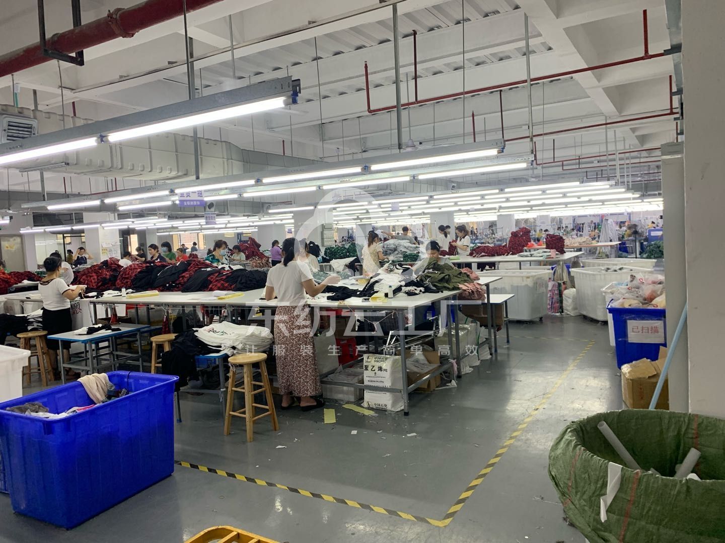 裤头车:1台,定扣机:1台,验布机:1台,断布机:1台,颗粒炉:1台,平车:25台,电烫炉:1台,打边机:8台,双针车:1台,电剪:2台,冚车:2台,唛架机:1台,裁床:1台,四线:8台