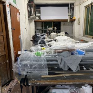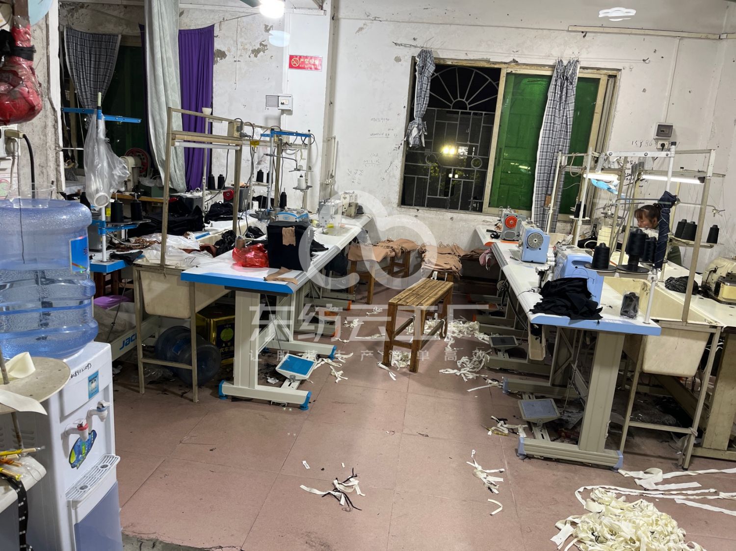 剪线机:1台,断布机:1台,吊机:1台,电烫炉:1台,电剪:2台,烫台:1台,冚车:1台,唛架机:1台,裁床:1台,四线:6台