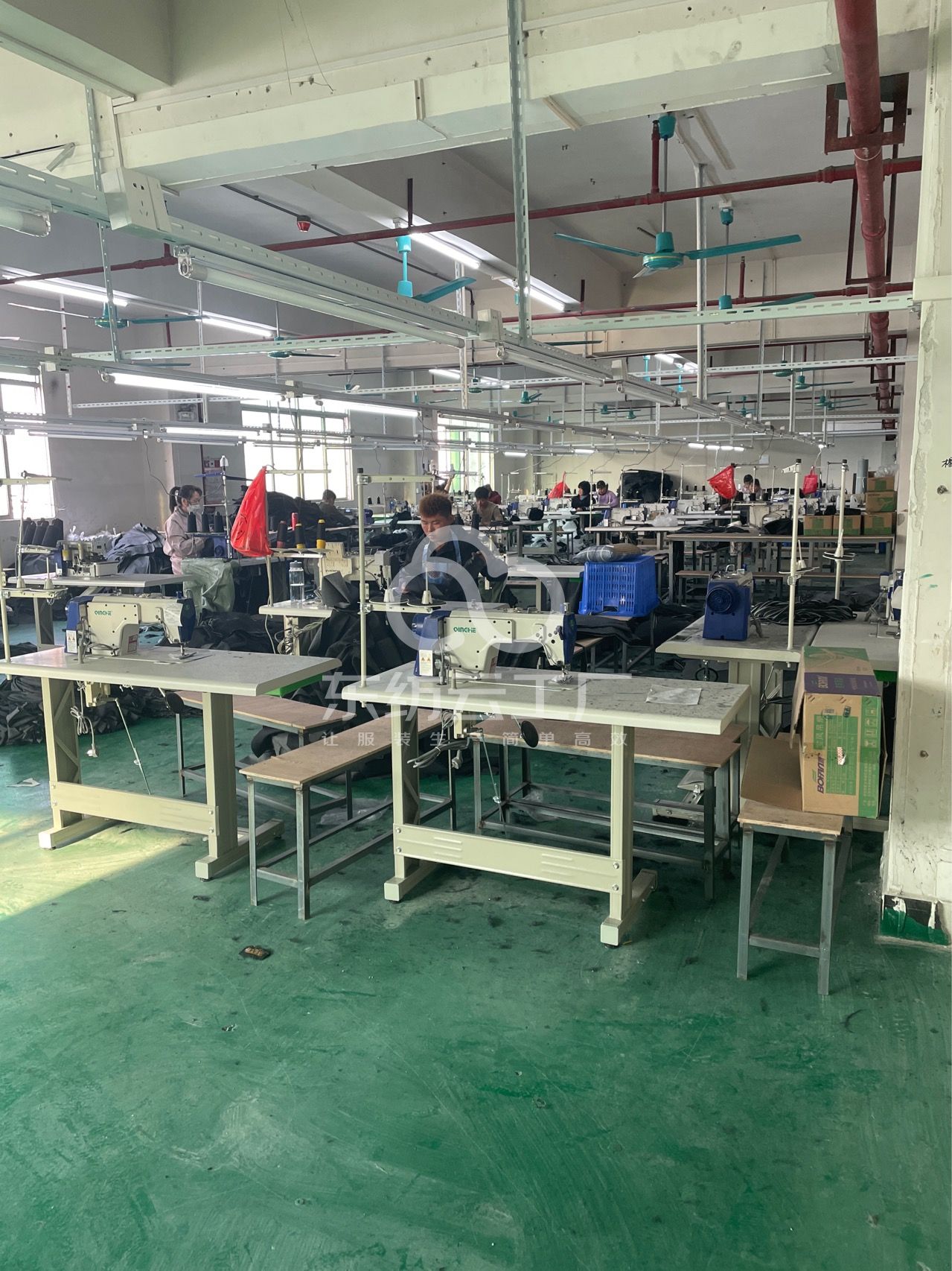 裤头车:2台,智能模板机:1台,松布机:2台,定扣机:2台,挑脚机:1台,剪线机:2台,验布机:1台,钉扣:3台,平眼:1台,平车:40台,电烫炉:2台,直眼:1台,电脑凤眼:1台,打边机:6台,双针车:6台,电剪:2台,烫台:2台,唛架机:1台,锅炉:2台,裁床:2台,五线:3台,四线:3台