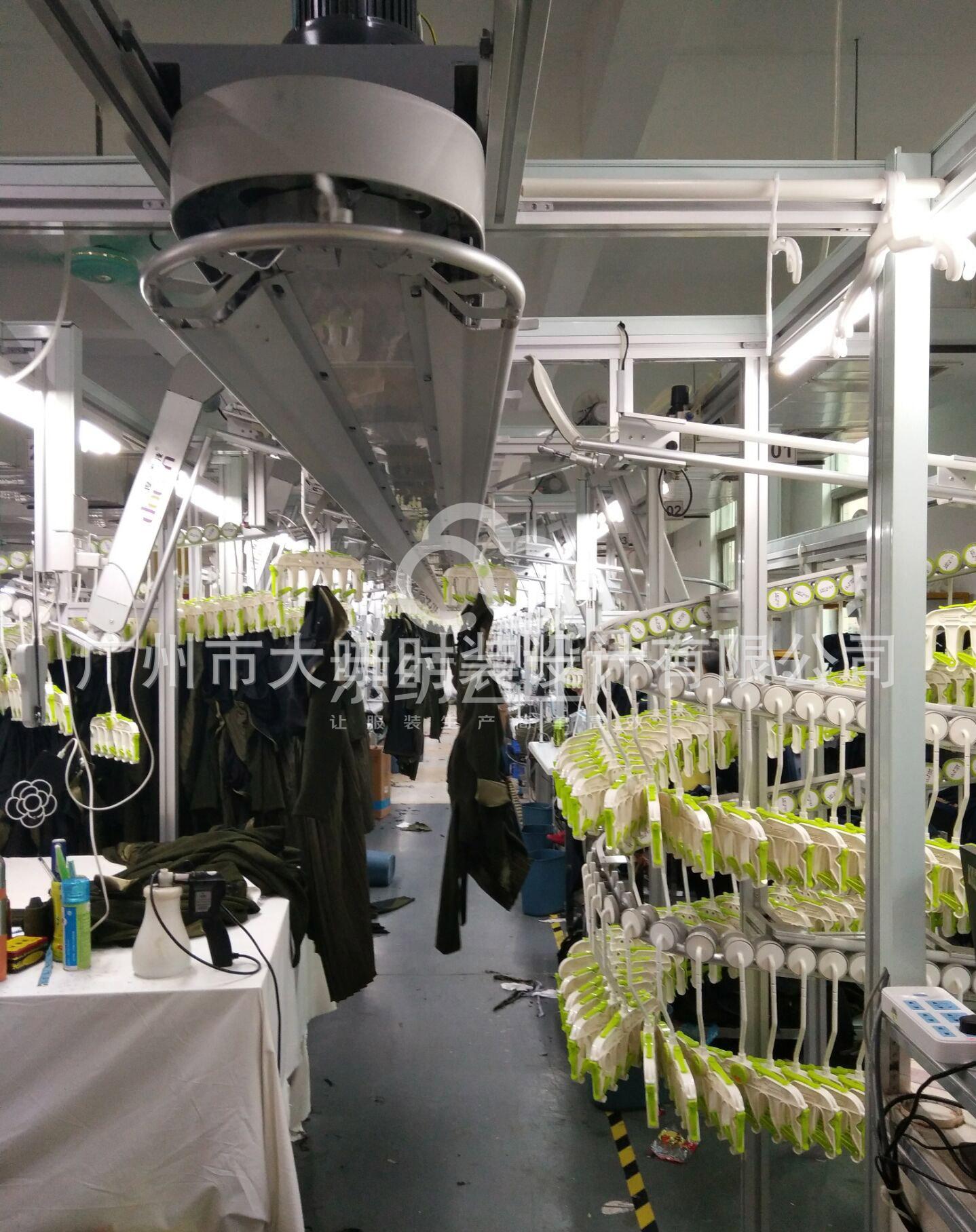 裤头车:2台,挑脚机:1台,剪线机:2台,验布机:1台,钉扣:1台,自动打扣机:2台,平眼:1台,平车:15台,电烫炉:2台,针扣机:2台,直眼:1台,电脑凤眼:2台,打边机:3台,双针车:2台,电剪:2台,烫台:3台,冚车:2台,唛架机:1台,锅炉:3台,水空调:2台,裁床:1台,五线:2台,四线:2台