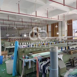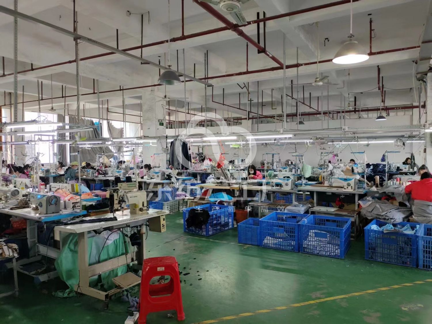 裤头车:5台,定扣机:3台,断布机:4台,钉扣:4台,自动打扣机:2台,平眼:5台,平车:100台,电烫炉:6台,直眼:4台,电脑凤眼:4台,打边机:12台,双针车:3台,电剪:5台,烫台:6台,冚车:2台,唛架机:1台,锅炉:6台,水空调:6台,裁床:3台,五线:4台,四线:8台