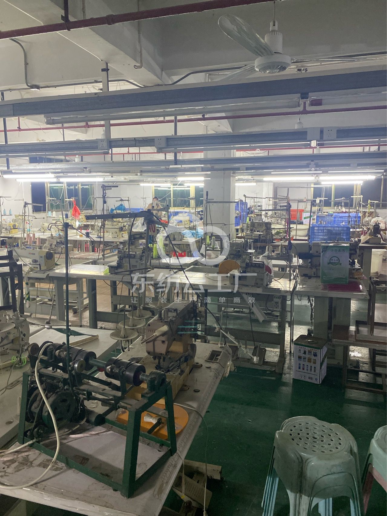 松布机:1台,挑脚机:2台,验布机:2台,钉扣:2台,自动打扣机:2台,平车:20台,电烫炉:1台,针扣机:2台,双针车:1台,电剪:1台,烫台:4台,冚车:3台,唛架机:1台,锅炉:1台,裁床:1台,五线:3台,四线:6台
