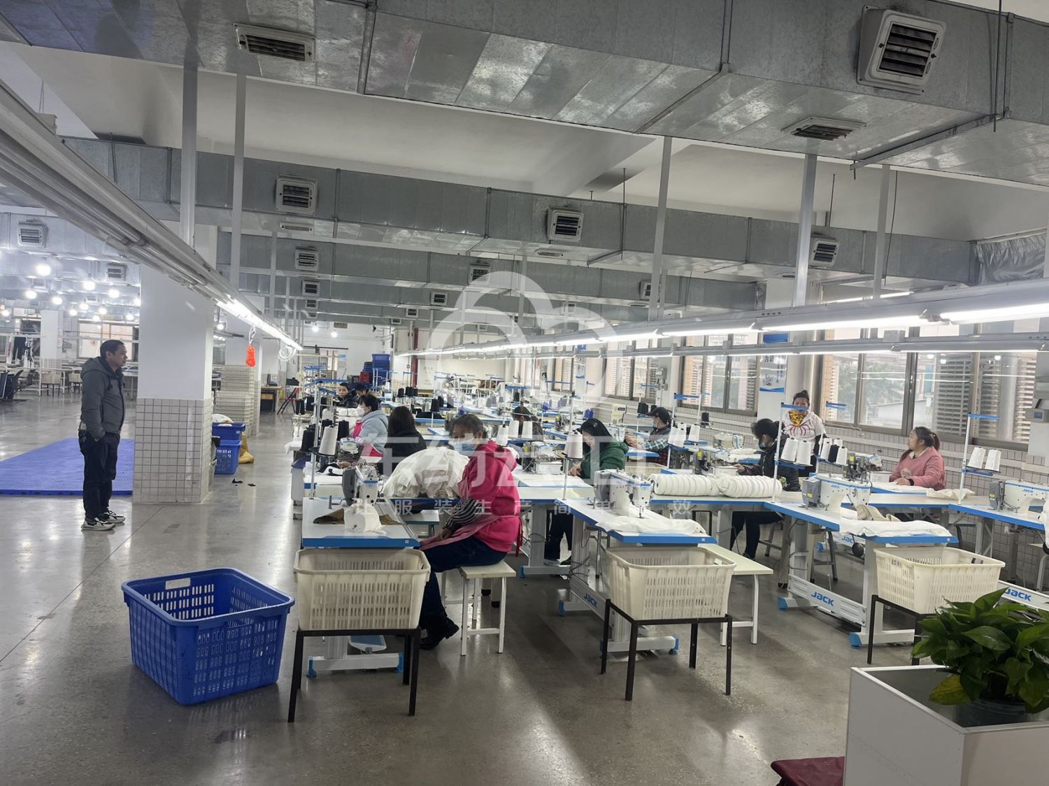裤头车:1台,松布机:2台,定扣机:1台,剪线机:1台,断布机:3台,钉扣:2台,自动打扣机:1台,颗粒炉:1台,平车:15台,电烫炉:1台,打边机:15台,双针车:5台,电剪:5台,烫台:8台,冚车:4台,唛架机:2台,锅炉:2台,水空调:10台,裁床:2台,五线:5台,四线:10台