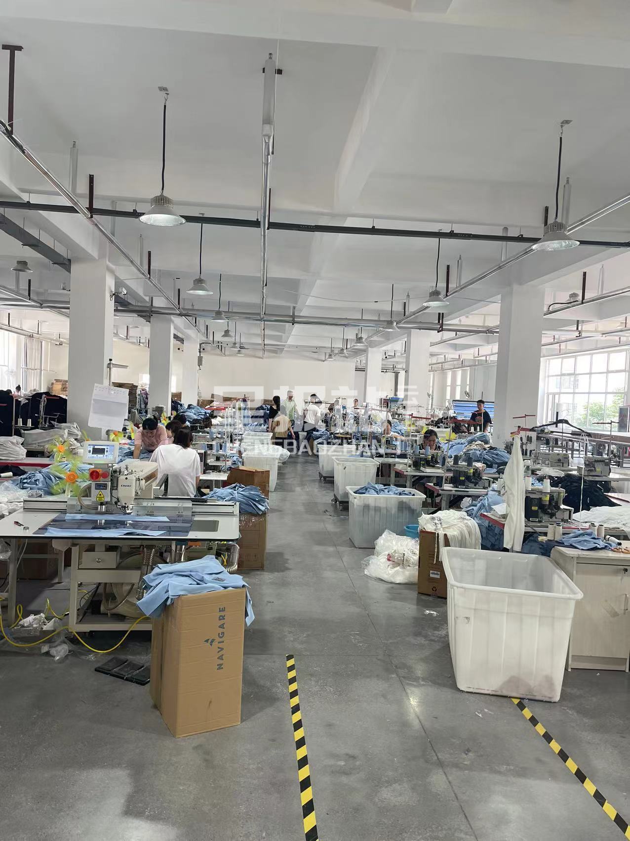裤头车:1台,智能模板机:2台,自动拉布机:1台,电脑自动裁:1台,松布机:1台,验布机:1台,断布机:2台,自动打扣机:2台,平车:50台,双针车:8台,烫台:10台,裁床:1台,五线:5台,四线:50台