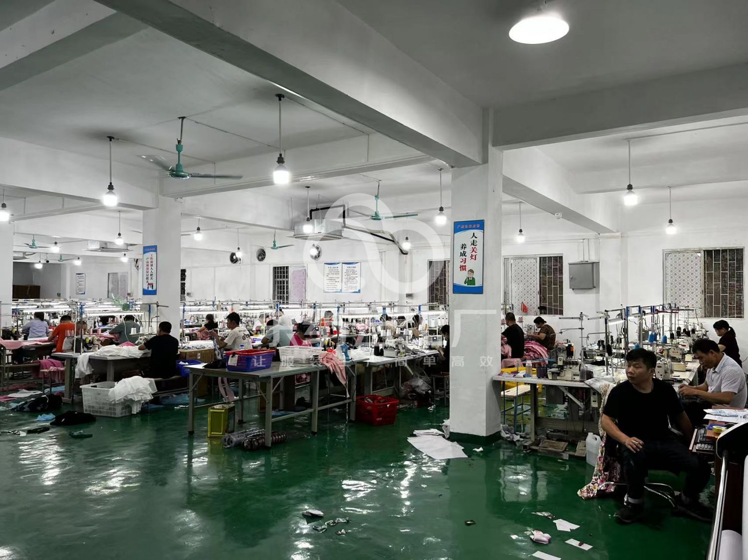 平眼:1台,平车:60台,电烫炉:2台,针扣机:2台,直眼:1台,电脑凤眼:1台,打边机:50台,双针车:5台,电剪:6台,烫台:8台,冚车:3台,唛架机:2台,锅炉:1台,水空调:10台,裁床:2台,五线:35台,四线:18台
