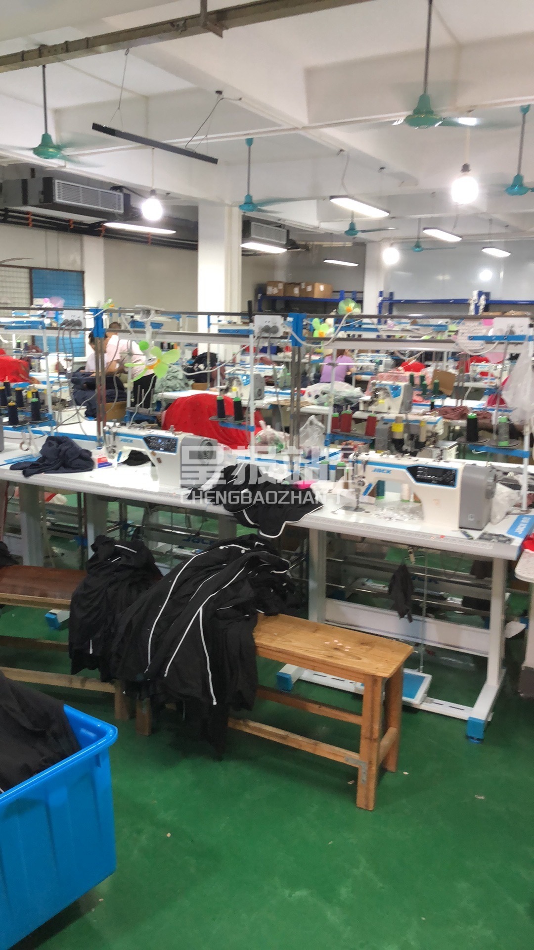颗粒炉:1台,平车:28台,电烫炉:1台,直眼:1台,打边机:9台,双针车:2台,电剪:2台,烫台:6台,冚车:2台,唛架机:1台,锅炉:1台,水空调:4台,裁床:1台,五线:5台,四线:9台