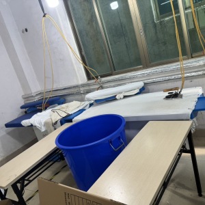 裤头车:1台,松布机:1台,定扣机:1台,挑脚机:1台,剪线机:1台,验布机:1台,断布机:1台,钉扣:1台,颗粒炉:1台,平车:30台,电烫炉:2台,双针车:1台,电剪:2台,烫台:2台,冚车:2台,唛架机:1台,锅炉:2台,水空调:4台,裁床:1台,五线:3台,四线:4台