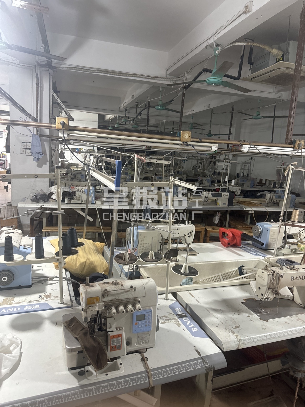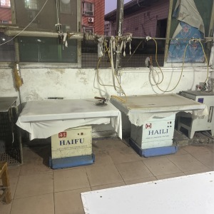 啤机:2台,定扣机:13台,剪线机:2台,断布机:2台,钉扣:2台,自动打扣机:2台,平眼:2台,吊机:2台,平车:40台,针扣机:2台,直眼:2台,电脑凤眼:2台,打边机:25台,双针车:5台,电剪:4台,烫台:6台,冚车:5台,唛架机:1台,锅炉:2台,裁床:2台,五线:25台,四线:25台