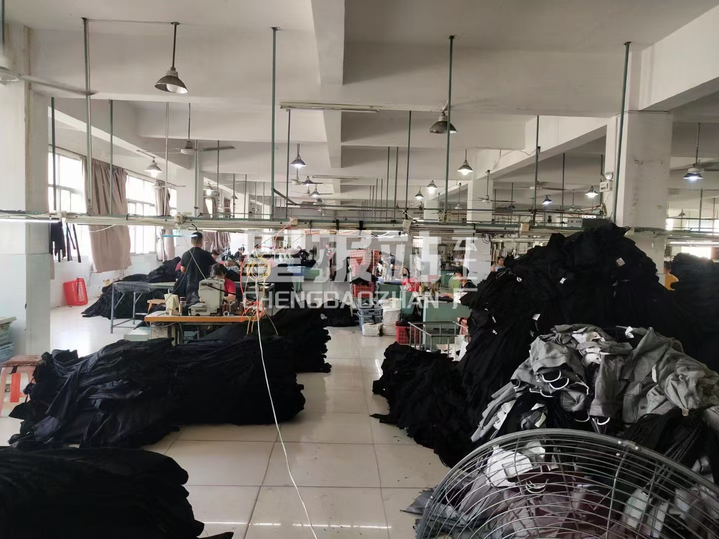 裤头车:2台,定扣机:1台,剪线机:2台,钉扣:2台,自动打扣机:1台,平眼:1台,平车:150台,电烫炉:1台,直眼:1台,电脑凤眼:1台,打边机:4台,烫台:3台,锅炉:1台,裁床:2台,五线:3台