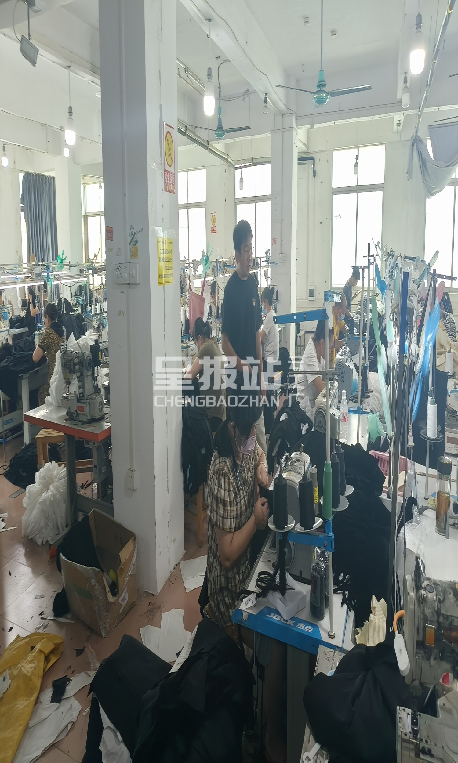 验布机:1台,电烫炉:2台,打边机:40台,双针车:40台,烫台:4台,冚车:5台,唛架机:1台,锅炉:1台,裁床:14台,五线:8台,四线:40台
