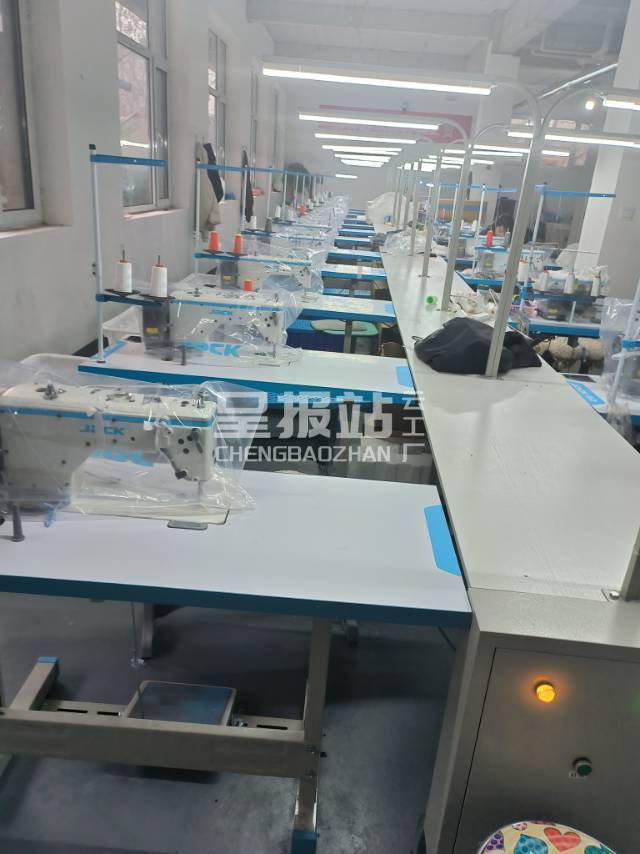 裤头车:1台,自动拉布机:1台,电脑自动裁:1台,定扣机:4台,断布机:2台,平眼:2台,平车:40台,针扣机:2台,直眼:1台,打边机:2台,双针车:4台,烫台:3台,五线:4台,四线:3台