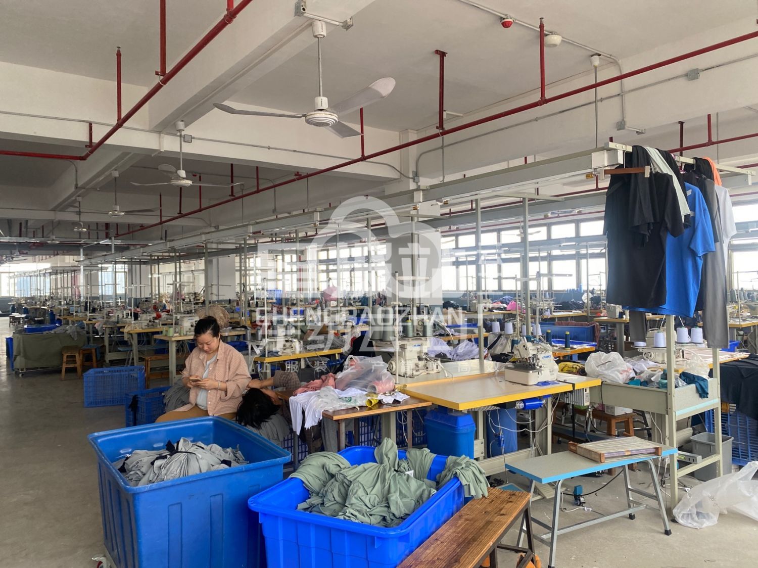 裤头车:5台,自动拉布机:3台,松布机:2台,定扣机:5台,剪线机:5台,验布机:1台,钉扣:5台,自动打扣机:1台,平车:150台,电烫炉:3台,电脑凤眼:2台,打边机:10台,双针车:10台,电剪:5台,烫台:10台,冚车:20台,唛架机:3台,裁床:4台,五线:5台,四线:3台