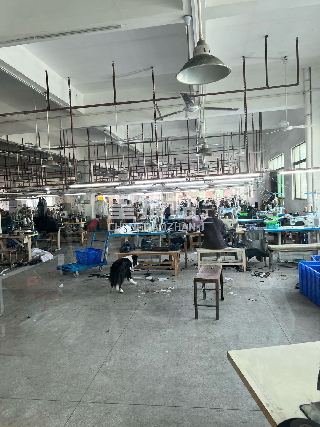 裤头车:3台,定扣机:3台,剪线机:4台,钉扣:4台,颗粒炉:1台,平眼:1台,平车:38台,直眼:1台,电脑凤眼:1台,打边机:12台,双针车:10台,电剪:3台,烫台:4台,唛架机:1台,锅炉:1台,裁床:2台,五线:8台