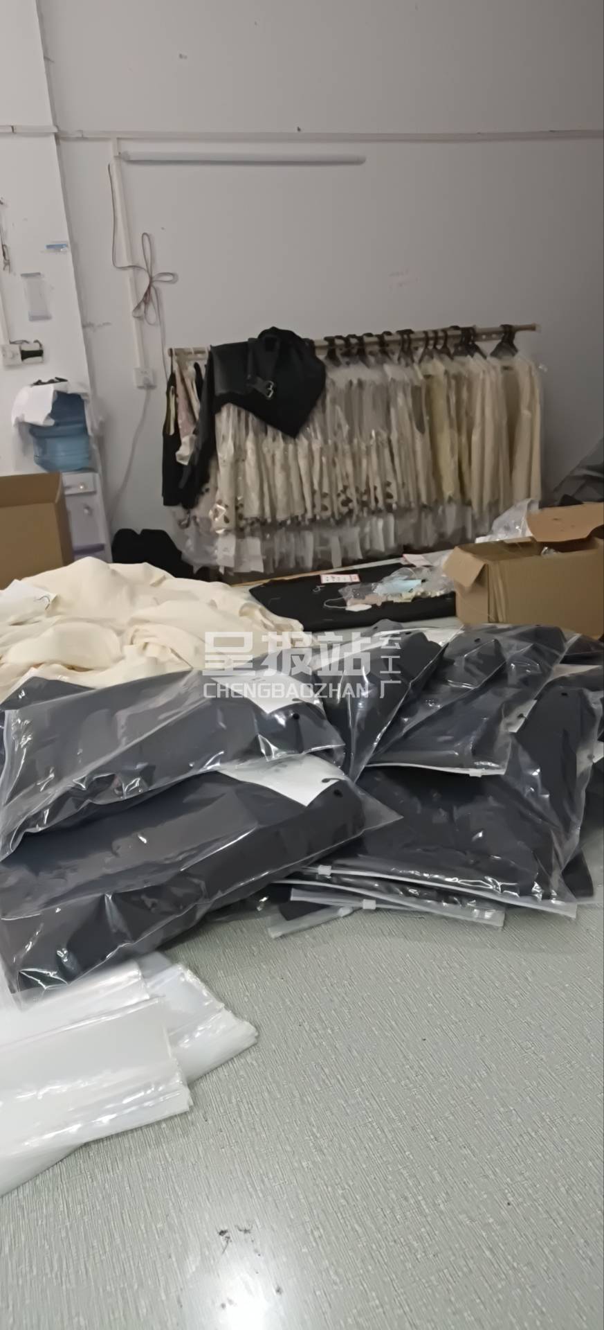 定扣机:2台,剪线机:1台,断布机:1台,平车:15台,针扣机:1台,电脑凤眼:1台,打边机:3台,双针车:1台,电剪:2台,烫台:3台,冚车:2台,唛架机:1台,锅炉:2台,裁床:1台,五线:2台,四线:4台