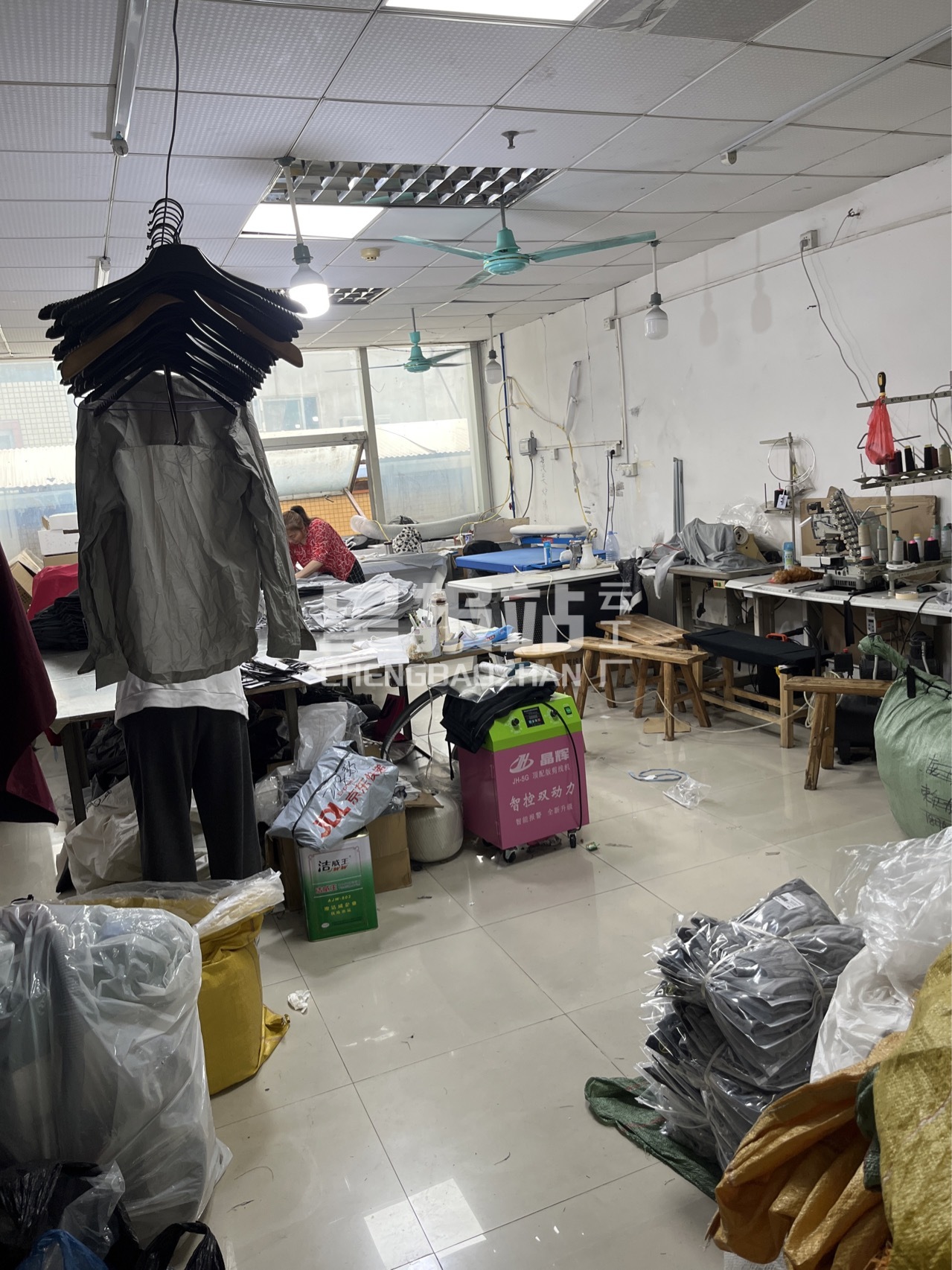 裤头车:1台,剪线机:1台,平眼:1台,平车:15台,双针车:1台,烫台:2台,唛架机:1台,五线:1台