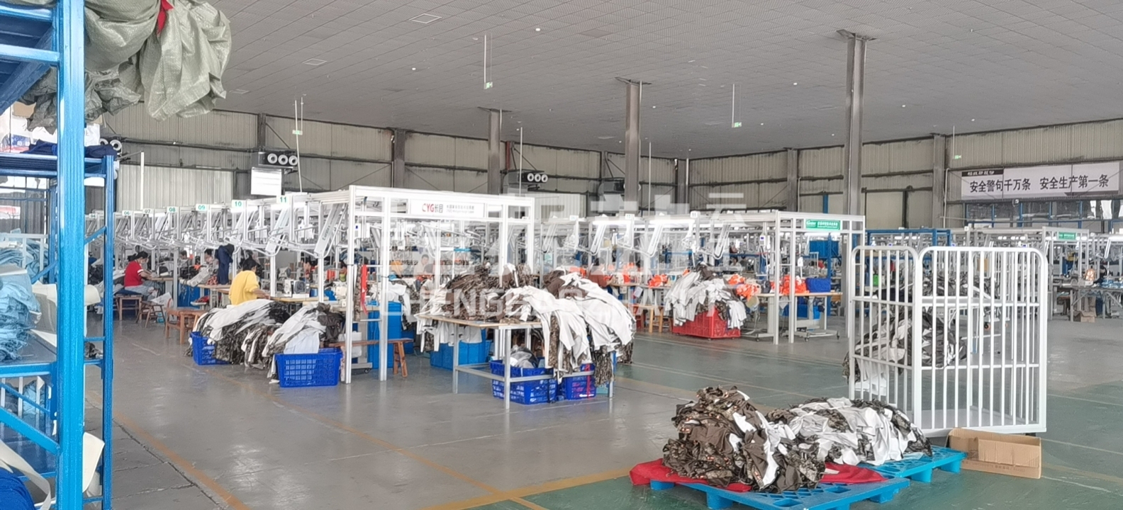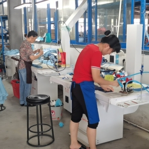 裤头车:1台,智能模板机:4台,自动拉布机:2台,电脑自动裁:2台,松布机:1台,定扣机:4台,挑脚机:1台,剪线机:2台,验布机:1台,断布机:2台,钉扣:4台,自动打扣机:3台,平眼:3台,平车:300台,电烫炉:6台,直眼:3台,打边机:8台,双针车:8台,电剪:3台,烫台:8台,冚车:3台,唛架机:2台,裁床:3台,五线:10台,四线:8台