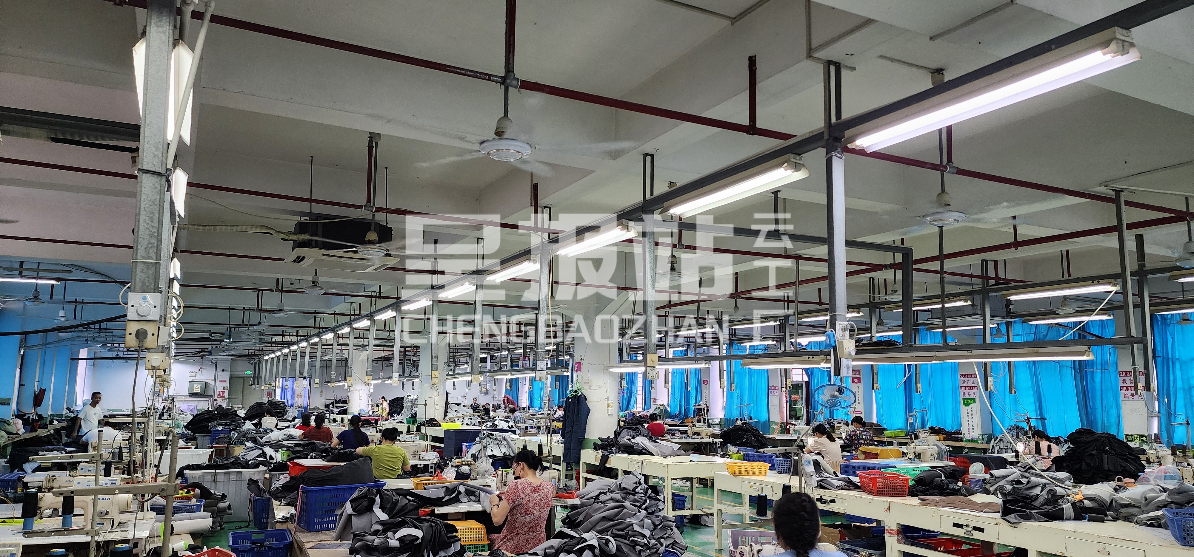 裤头车:2台,智能模板机:6台,自动拉布机:1台,松布机:1台,剪线机:1台,验布机:1台,断布机:1台,钉扣:8台,自动打扣机:6台,平眼:2台,平车:200台,电烫炉:2台,直眼:2台,电脑凤眼:1台,打边机:11台,双针车:6台,电剪:6台,烫台:10台,冚车:2台,唛架机:2台,水空调:20台,裁床:5台,五线:10台,四线:10台