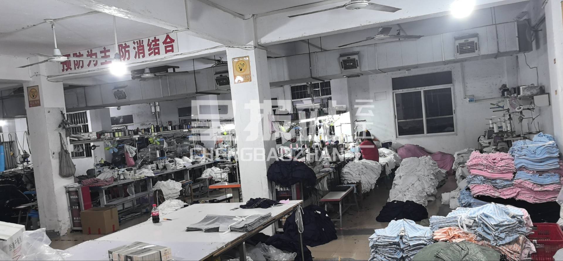 断布机:2台,吊机:1台,平车:8台,电烫炉:2台,打边机:12台,电剪:4台,烫台:2台,冚车:4台,唛架机:1台,锅炉:1台,水空调:1台,裁床:1台,四线:12台