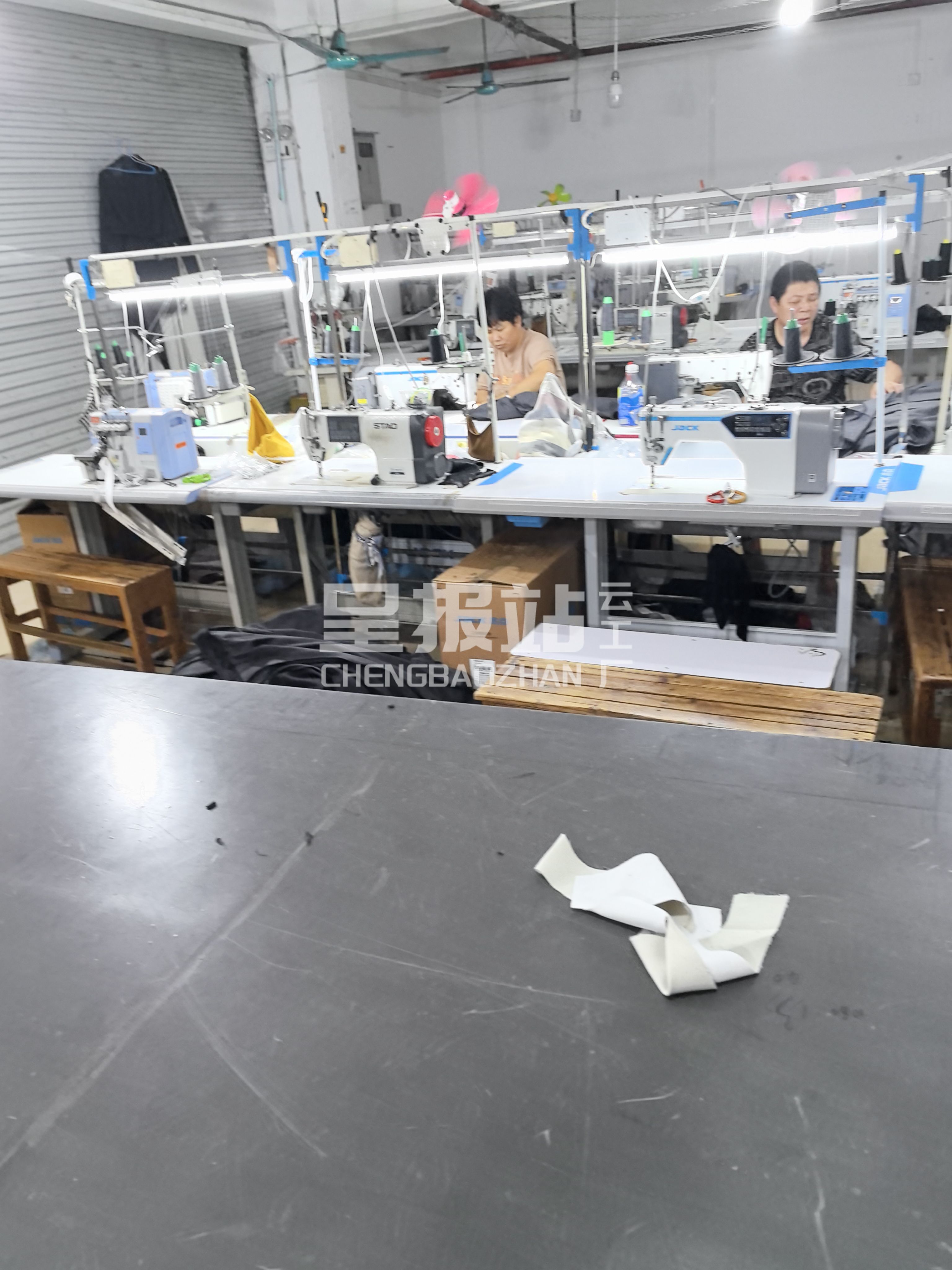 剪线机:1台,断布机:1台,钉扣:1台,颗粒炉:1台,电烫炉:2台,针扣机:4台,打边机:10台,双针车:1台,电剪:2台,烫台:2台,唛架机:1台,锅炉:1台,水空调:2台,裁床:1台,五线:1台,四线:10台